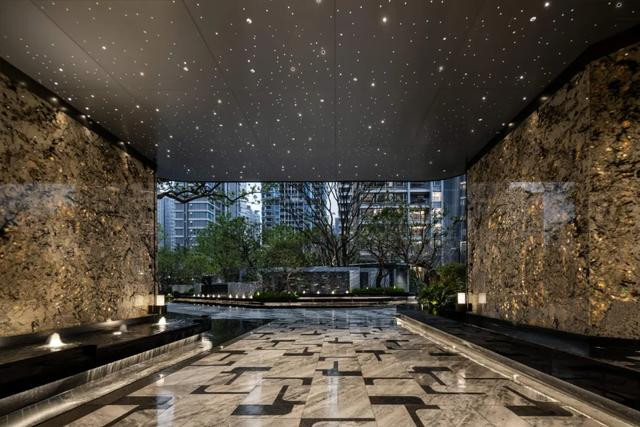 在项目主入口庭院,可以看到百万级“双生罗汉松”、鎏金星空顶、巴西奢石铂金钻、蓝翡翠奢石玉盘迎客水景…