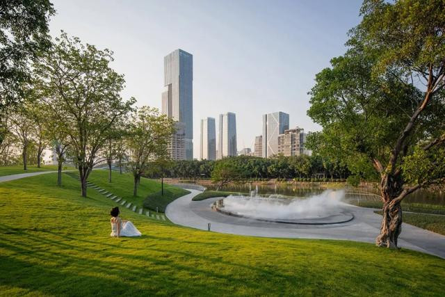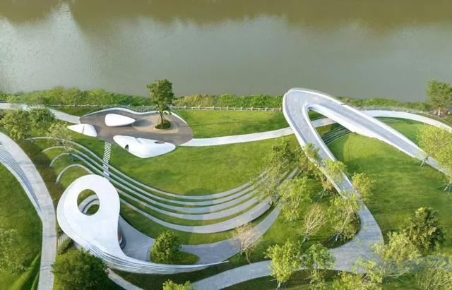 在红线外,越秀地产搭桥过河链接CBD,打造绿色空间,种植大面积的草坪和树林,衍生出超2万方的世界级美学公园,形成CBD稀缺的亲水驳岸,带来松弛享受。