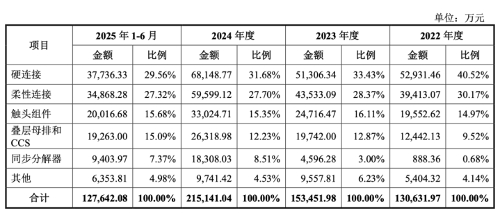 报告期内,硬连接产品的营收规模一直最高,但占主营业务收入比例从2022年的40.52%降至2025年上半年的29.56%。