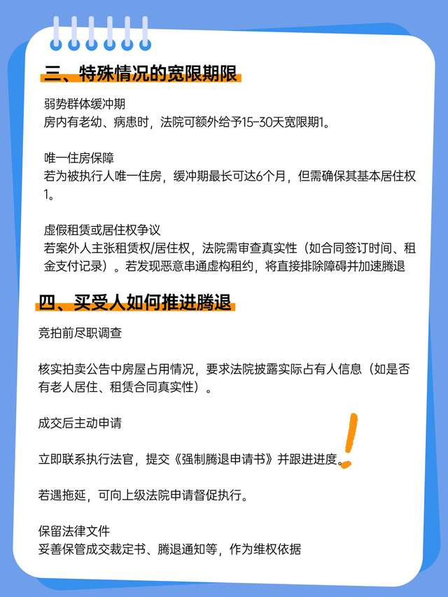 总的来说,法拍房的强制腾退是有一定期限的,但具体时长会因各种因素而异。